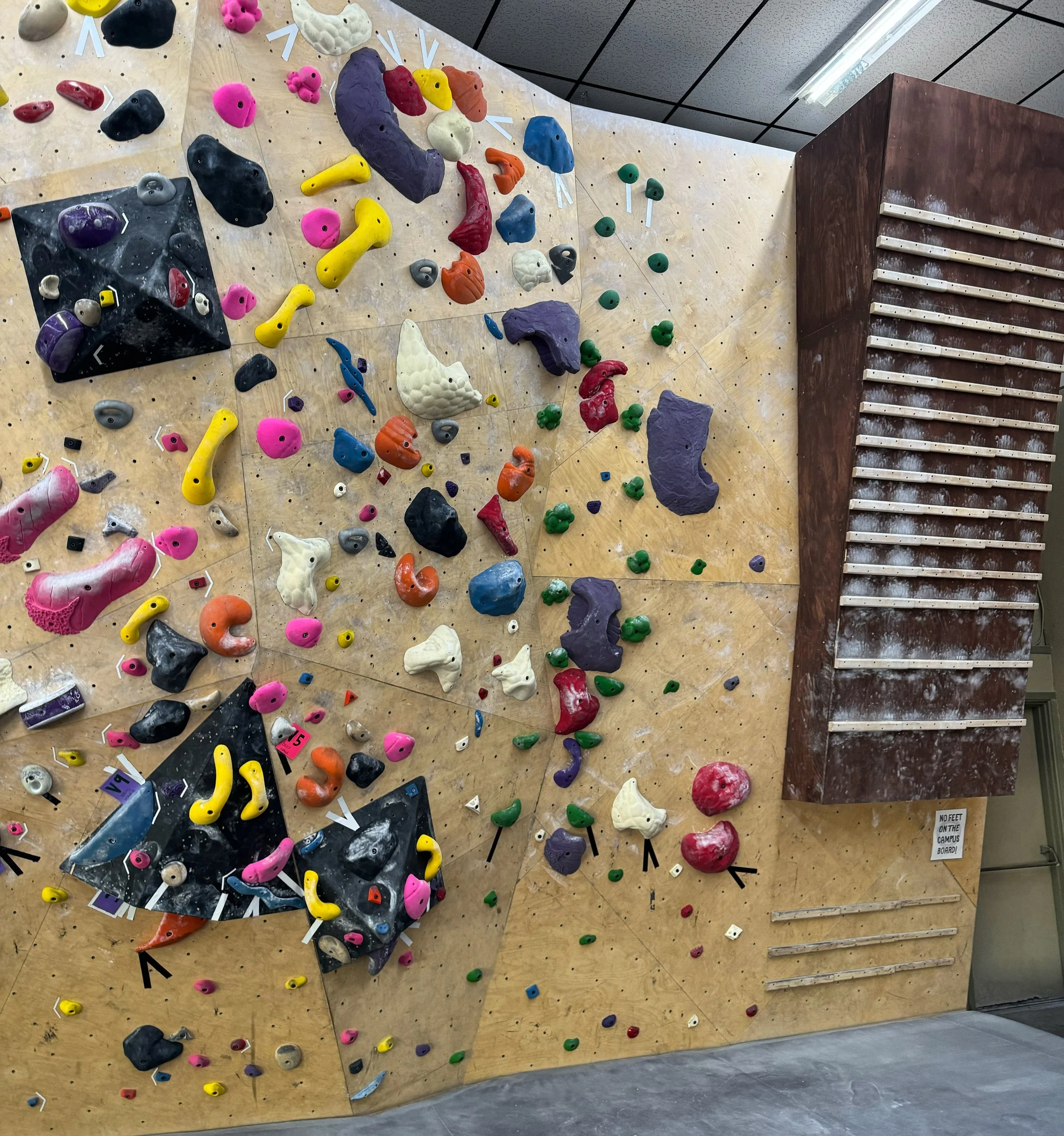 Please ask the staff if you have any questions about falling, downclimbing, or gym etiquette; we’re here to help. We have around 120 routes from V0 to V9, so you’re sure to find something to enjoy. We reset a section of wall every other week so you’ll always have fresh routes to climb on!